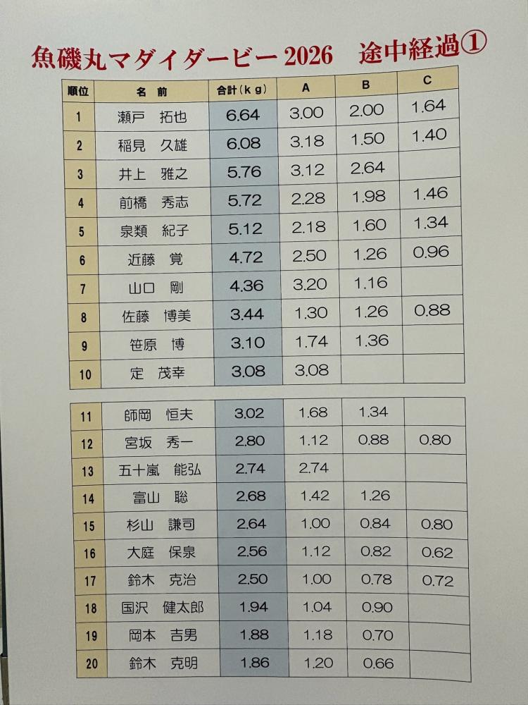 | 日程 | 午前マダイ | 午前泳がせ釣り他 | 午後マダイ | 夜釣り |