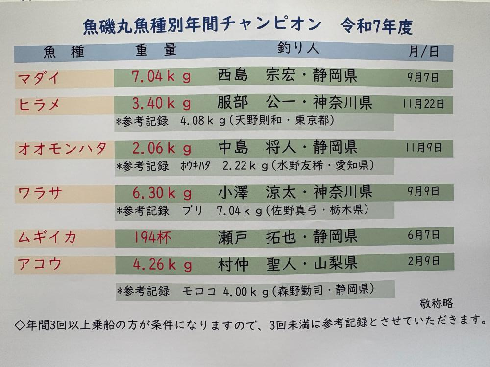 ★魚種別年間チャンピオン、訂正ありワラサ追加しました。(スミマセン)